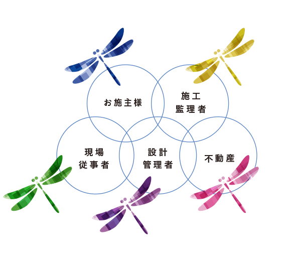 品質・精度の高い建築を創ります。トンボの特徴は、素早く広い行動圏を巡回するように飛び回る行動が特徴的で、“前進するのみで後退しない”生態系から「勝ち虫」と呼ばれています。